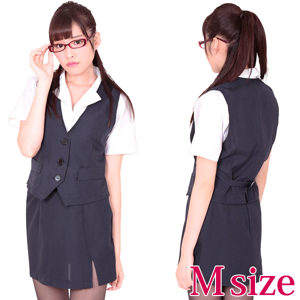 紺と白の定番オフィスレディのセクシーコスチューム。落ち着いた紺色が清楚な秘書の雰囲気を演出!セクシーな胸元の半袖ブラウスとミニスカート、3つボタンベストのなりきりコスプレ3点セットで魅力的なOLに変身しちゃおう!※Lサイズ(b17495)、LLサイズ(b17521)あります。※メガネは付属しません