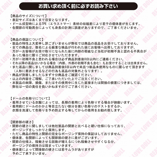 ●高身長な165cmのほっそりボディ●モッチリ柔らか弾力エラストマー●Mサイズの服・衣装を着せられる●目線・首・関節は自由自在に可動●あらゆる体位・ポージングも簡単●ほんのりメイク済みの美しい表情●柔らかな唇でフェラチオプレイも●ヴァギナ…着脱可能な付属オナホ●アナル…ドール内部のリアルヒダ●バスト…憧れのパイズリプレイOK●その他グッズ付属の充実セット。