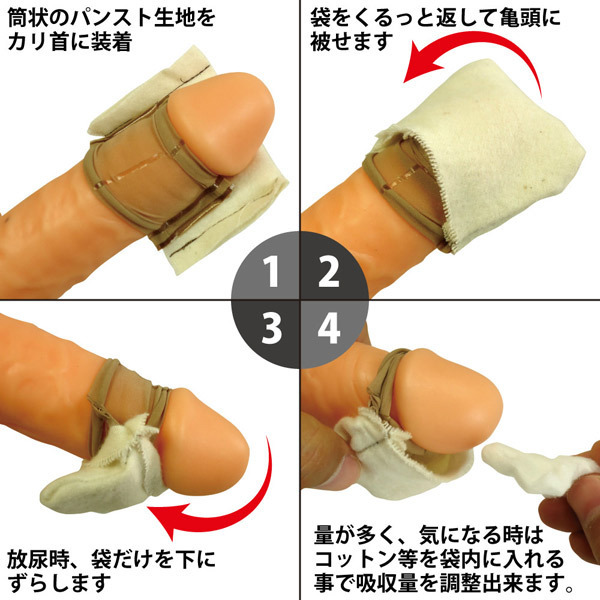 ●ネル生地と通気性がいいストッキング素材を採用●パンスト生地をカリに装着して袋を亀頭に被せるだけ●放尿時は袋だけを下におろせばOK●カバー内部にコットンなどを入れると吸収率UP●わずかな漏れもしっかり防止●ズレにくいのでスポーツ時も装着可能。