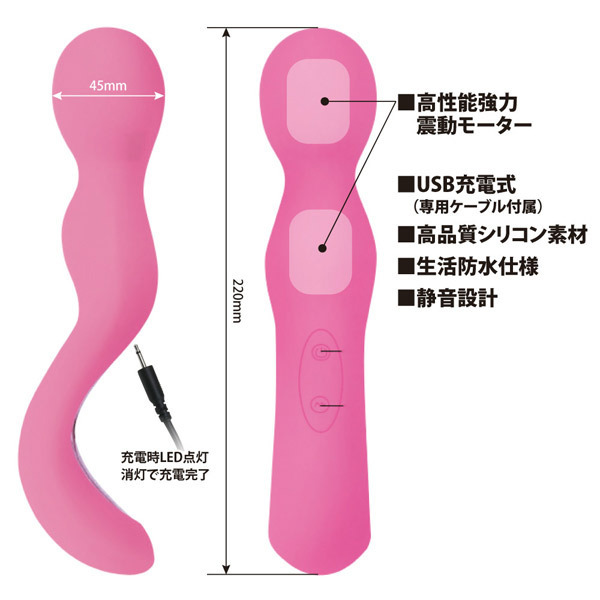 ●身体にフィットする曲線ボディ●安心安全な高品質シリコン素材●全長22.0cm、ヘッド径4.5cm●ヘッドと中腹にWモーター搭載●かつてないパワフルな振動刺激●市販のアタッチメントも装着可●30パターンの振動機能を装備●USB充電式(専用コード付属)。