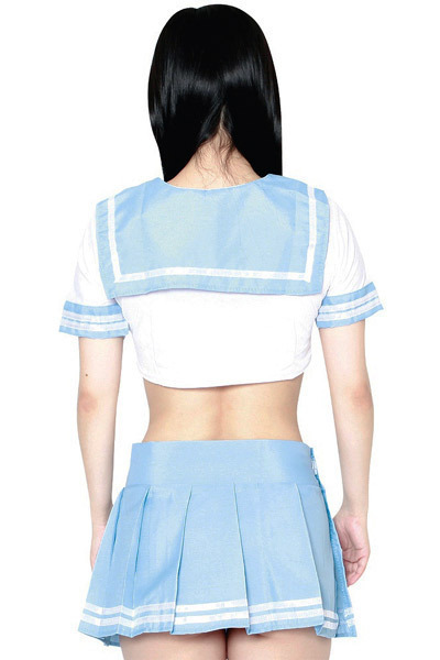 パステルブルーの淡い色味が可愛いミニ丈セーラー服コスプレ。