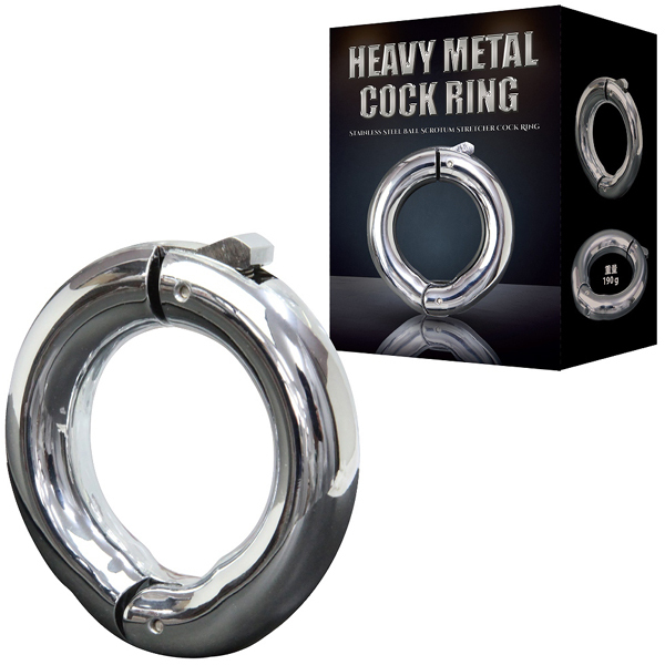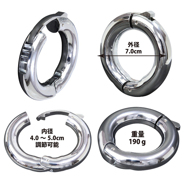 重さ約190gの重厚感のあるステンレス製ペニスリング。ワンタッチ装着で着脱楽々!内径は4〜5cmサイズで調節可能♪引っ張られる重厚感と締め付けがたまらないメタル仕様のペニスリングです。収納袋付