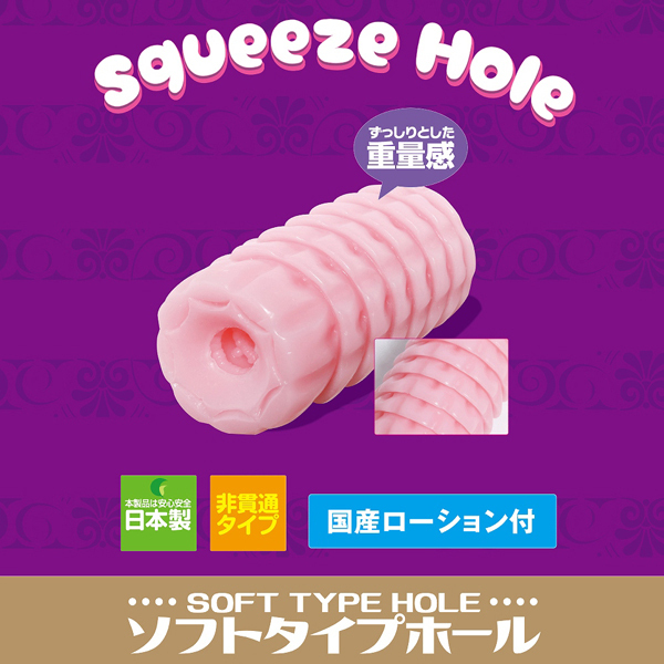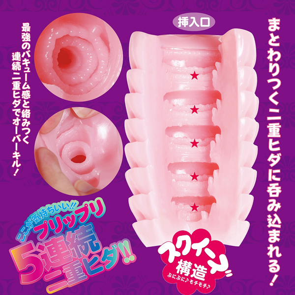 もっちり柔らかな二重ヒダが5連続で刺激する日本製の非貫通オナホ。にぎられるような挿入感♪奥に挿入するほど締め付けが増す激快感構造で即イキ必至!国産ローション付き