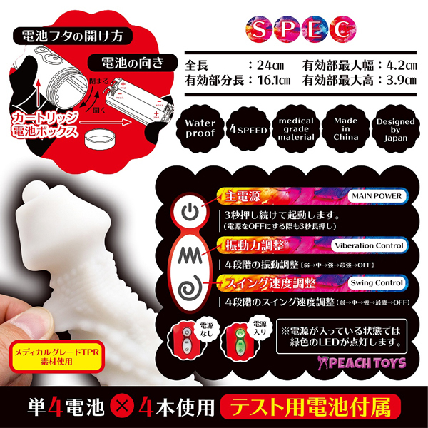 柔らかく弾力のある初心者に優しい医療用シリコン素材を採用!ボディにイボ突起、挿入部分を約16cmと長くしたことで、奥イキ好きが「ヤバい」と唸るほどのクオリティに仕上げました♪先端部分には強力ローターを内蔵しているので、身体の芯まで響く振動をご堪能いただけます。