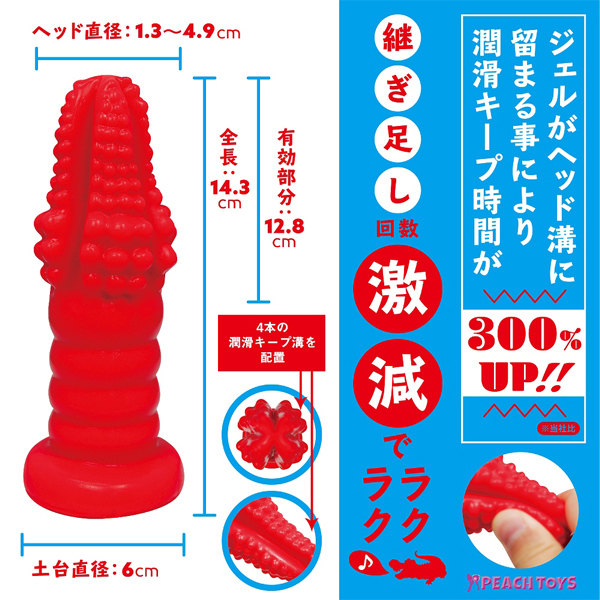 ほんのり弾力のある硬め素材を使用したワニヘッド形状の日本製ディルド。プレイ中、早く乾いてしまうといった悩みを改善すべく、先端部分にはローションが溜まる4つの深溝を配置!継ぎ足し回数を最小限に留めスムーズなプレイをサポートします♪先端から下にかけて太くなるワニ型ヘッドで、初心者から上級者の方まで幅広くお楽しみいただけます。