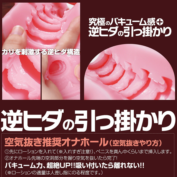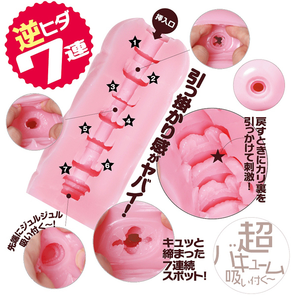 超強力バキュームと7連続する逆ヒダ構造が刺激する日本製の非貫通オナホ(国産ローション付属)。空気抜きすればバキューム感が一気にUP、一度吸い付いたら最後まで離さない♪