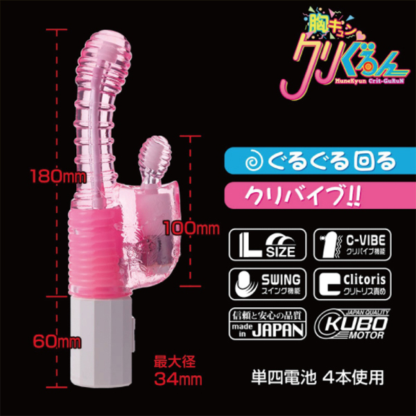 世界初のWスイング機能で旋風を巻き起こす!親機&子機がダブルでスイングする電池式バイブ(日本製)。凹凸形状で挿入刺激を与えながら、6Vモーターの力強い回転で、中を掻き乱しながら外を舐め回すようにグルグルと回転!これまでにない革命的な快感が全身を駆け巡る♪単四電池を4本使用