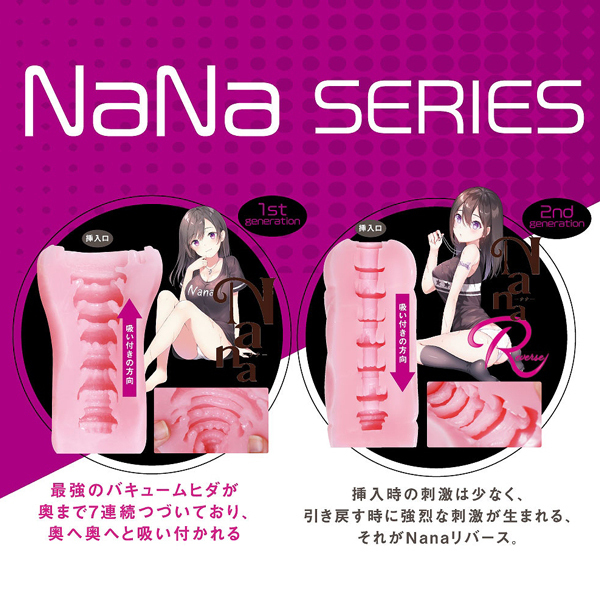 逆ヒダによるカリ刺激が特徴の「Nana(ナナ)Reverse(b29107)」がバキューム力を強化してさらに進化!全長15cm、内部長14cmの波打つ7連ヒダ構造の非貫通オナホ。肉厚440gのインパクトあるボディは内部も奥までしっかりヒダ尽くし!中の空気を抜けば強力なバキューム感を体感していただけます。国産ローション付