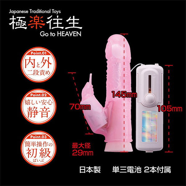 手頃に使えるハンディサイズで気持ちいいところを内外から同時に責められるシンプルバイブ「極楽往生」。