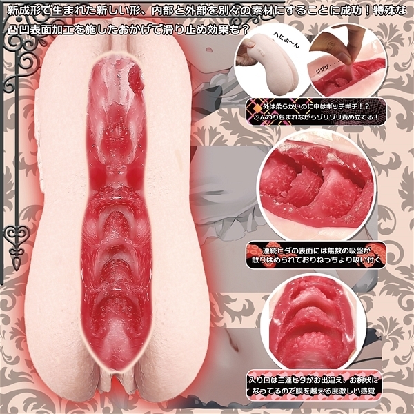 大きな三連返しヒダと細かなイボは上下を逆転させる事で全く異なる使用感が楽しめる!520gの大型ボディの素材には厚生労働省、食品衛生法第370号に準拠した「Magiceyes Skin」を採用しているので安心してご使用頂けます。