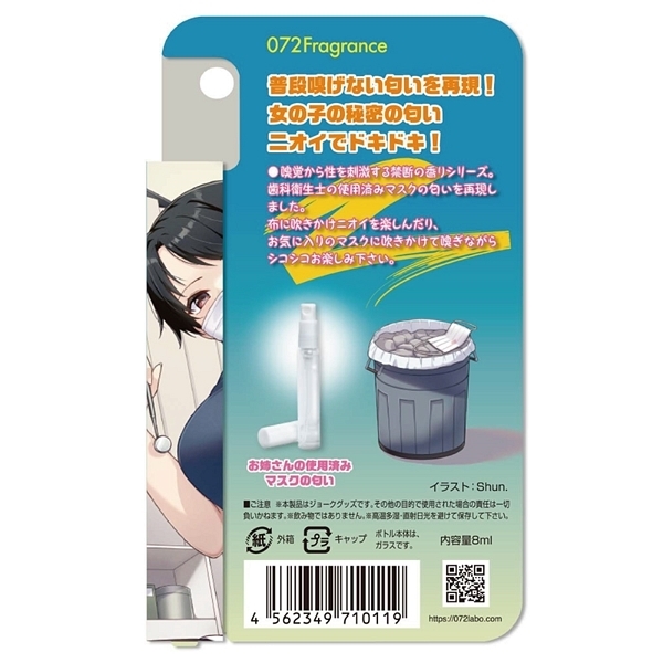 普段は嗅げない禁断の香りを再現した究極のニオイグッズ!嗅覚から性を刺激する禁断の香りシリーズから、歯科衛生士のお姉さんのマスクの内側の香りを再現♪布に吹きかけニオイを楽しんだり、お気に入りのマスクに吹きかけて嗅ぎながらシコシコ楽しんだりと使い方はいろいろ!嗅ぐオナニーであなたの性活を応援致します♪