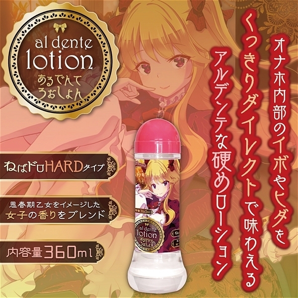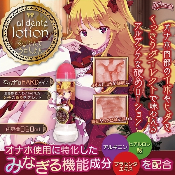 ねばドロHARDタイプ「あるて?んて ろーしょん」はオナホ内部をくっきりダイレクトに味わえる「アルデンテ」な硬めローション。イボの凹凸が鮮明になり、繊細なヒダ感触もしっかり分かる「硬め粘度」で配合しました。成分には「アルギニン・ヒアルロン酸・プラセンタエキス」を調合。みなぎる機能成分でオナホ使用に最適なローションとなっています。