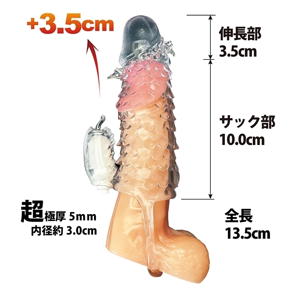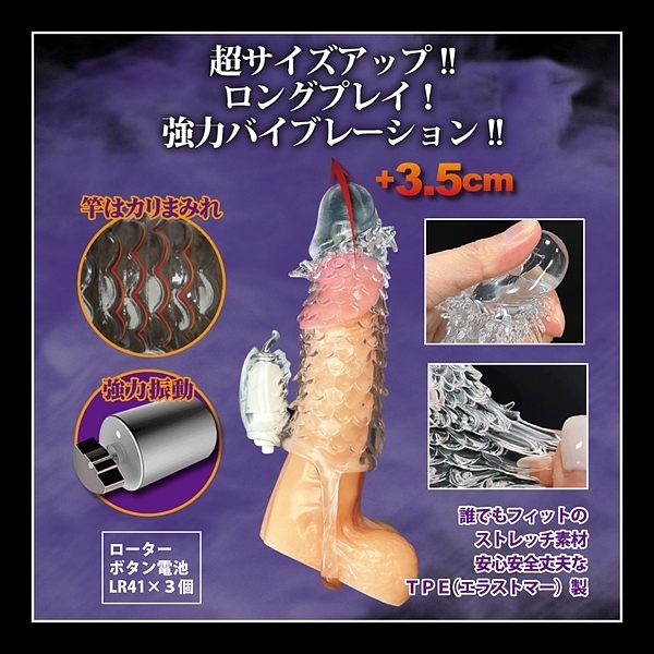 プラス長さ3.5cm、太さ1cmに強力振動を加え、その姿まさに凶器!超サイズアップ!!ロングプレイ!ウロコ状のボディは超刺激的!誰でもフィットのストレッチ素材。