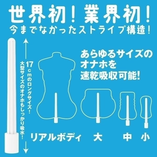 スポンジのように超吸水!プラスチックのようにカタくて丈夫!そしてオナホに合わせた特殊フォルム!硬質PVA素材を採用した、新時代のオナホ速乾ドライスティックが爆誕!軽い!硬い床に落としても傷つかない!濡れても変形しない!なめらか加工でオナホにやさしい!驚異的な吸水量なのに、珪藻土スティックやスポンジ製品の苦手要素をすべて克服。
