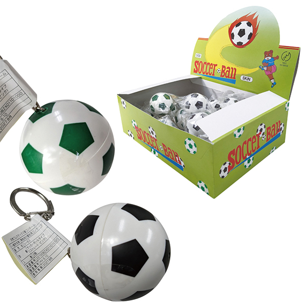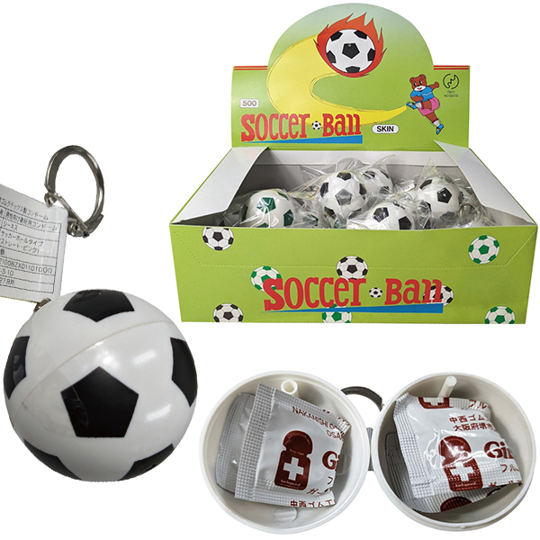 サッカーボール型のキーホルダーを開けると香り付コンドームが入っています♪カバンにつけても馴染む、キーホルダー収納タイプ!