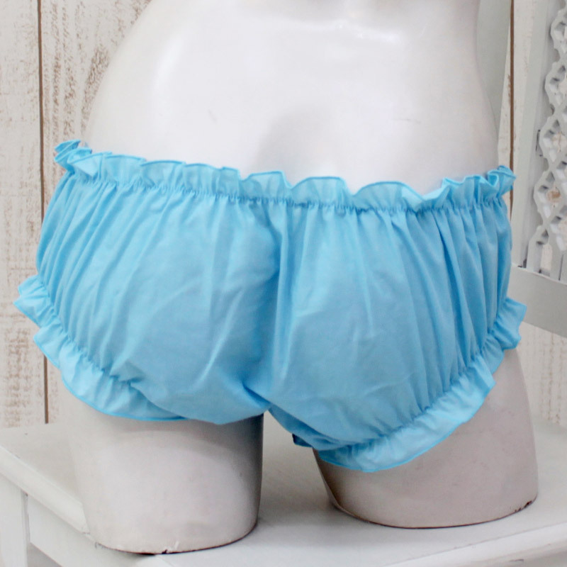 ●優しい水色の癒しカラー●ゆったりした履き心地の大きめBIGサイズ●腰周りと足ぐりをフリルで囲ったラブリーデザイン●浅履きのフルバックタイプ●素材はコットン35%、ポリエステル65%を使用。