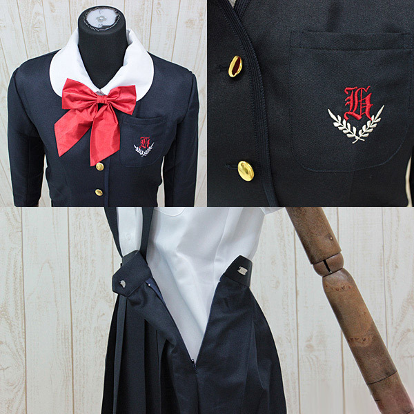 ●B〜108cm・W〜91cm・男性でも着用可能なBIGサイズ●ブレザー(胸ポケット刺繍入り)●キュートな丸襟ブラウス●乙女チックな吊りスカート●存在感バツグンな赤リボン●長袖(冬制服タイプ)。