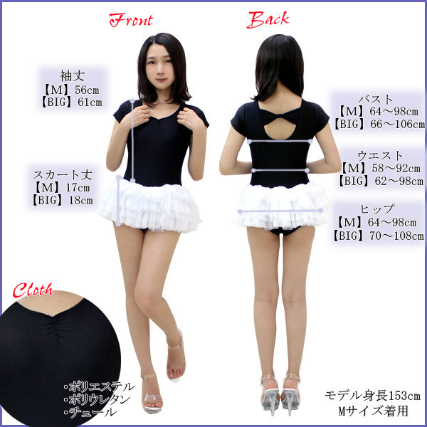 Mサイズ:B62〜98cm・W58〜92cm・H64〜98cm・着丈54cm・袖丈11cm・スカート丈17cm セット内容:レオタード単品(一部当て布付き) 素材:ポリエステル、ポリウレタン、チュール