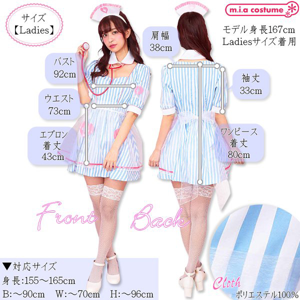 対応サイズ:身長155〜165cm・B〜90cm・W〜70cm・H〜96cm 実寸:B92cm・W73cm・肩幅38cm・袖丈33cm・着丈80cm、エプロン丈43cm セット内容:カチューシャ、付け襟、ワンピース(背中心ファスナー)、エプロン、腕章、聴診器 素材:ポリエステル100%