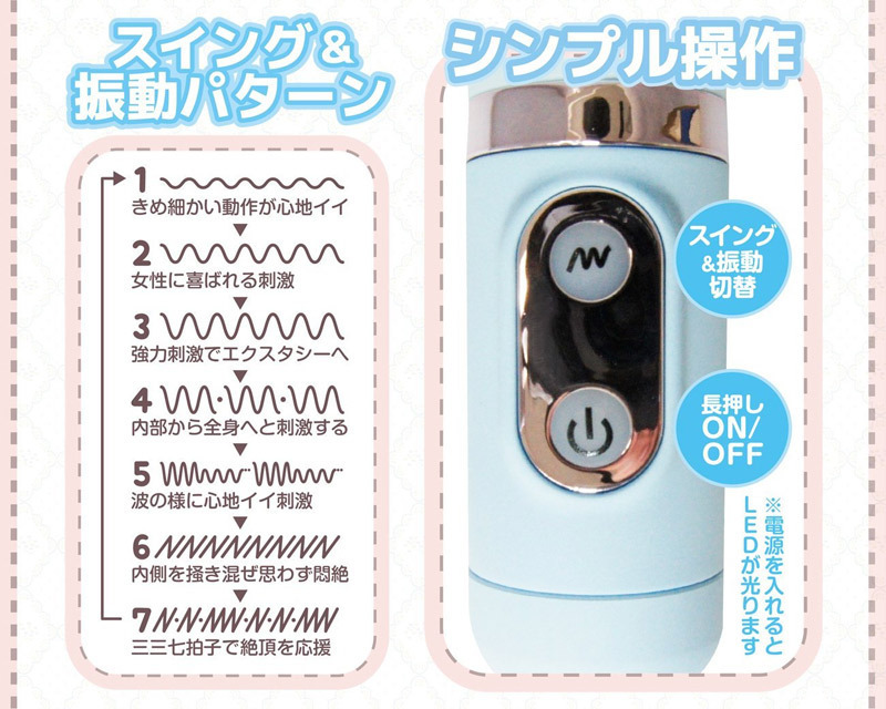 ●ミルキーブルーの可愛いボディ●3点責めできるトリプル仕様●振動&回転は三三七拍子を含む全7種●電源・切替え用ボタンのみの簡単操作●下ボタン長押しで電源ON/OFF●ボタンにLEDライト搭載●芯棒でスイング幅も調節可。