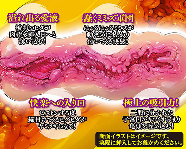 尾髭丹氏の魅力的な女性を描く絵とA−ONE社のコラボレーションによる非貫通オナホ「名器百景」♪入り口から大きくうねる複雑なヒダが連なり、トルネード状のヒダと横ヒダが奥深くまで続き、まさに「ミミズ千匹」の名にふさわしい構造を持っています。