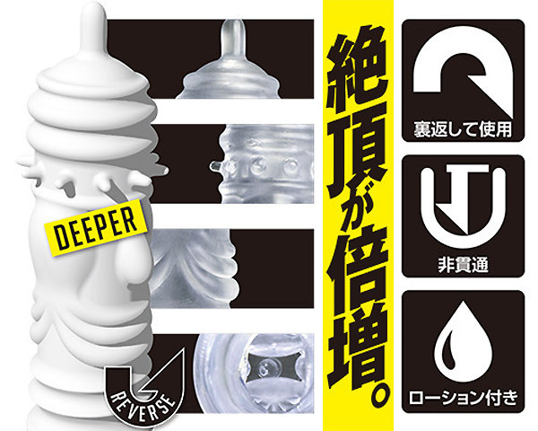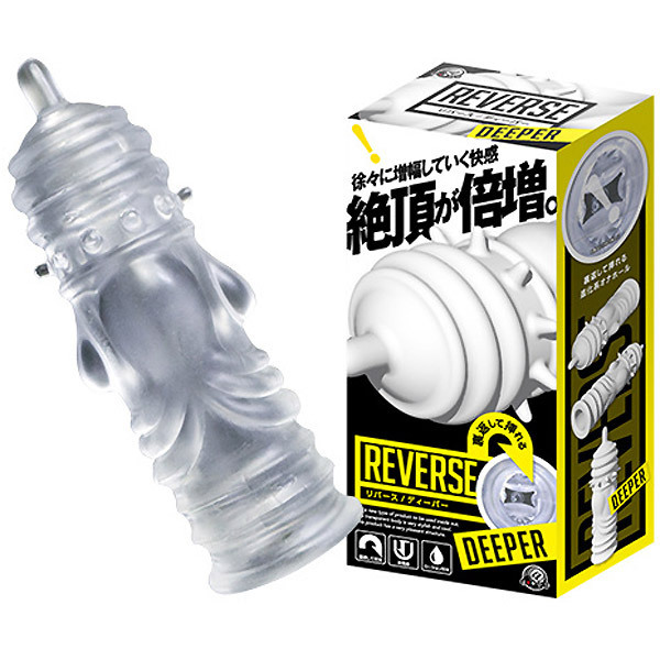 ●ペニスサック風クリアボディ●イボヒダ系ギミックの「DEEPER」●挿入時は裏返して突起を内側に●奥突きの度に先端突起が刺激●カリを360度刺激するイボ突起付き●裏返しやすいので洗浄も楽々。