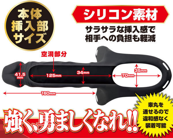 自信のない男性も、スキンを被せるように装着するだけで強く逞しい男に変身!挿入感滑らかなペニスバンド。相手の身体に負担をかけにくいシリコン製で、亀頭部分は穴あき仕様なので開放的♪大きく程よく反ったボディで刺激的なプレイを。睾丸を通す穴付き、ベルトはマジックテープ仕様