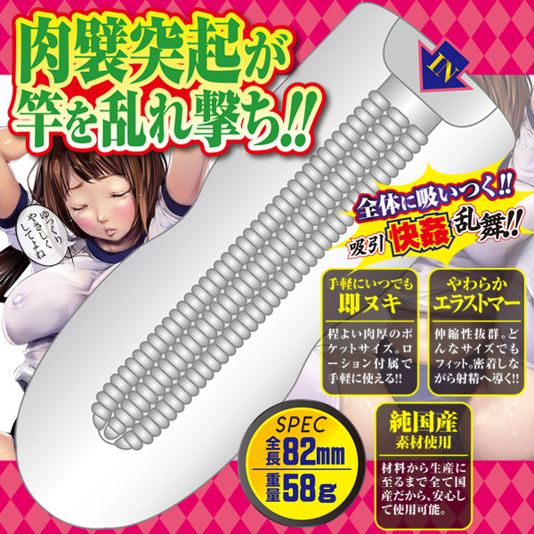 性欲女子とサクッとひとヌキ!エーワン×尾髭丹が送る最強ミニオナホシリーズ!肉ヒダ突起の連続で射精感をグングン高めてくれるミニサイズの非貫通オナホール!肉襞突起が、サオを乱れ撃ち、ゾリゾリ感が心地いい!程よい肉厚のポケットサイズの、ローション付属なので手軽に使える!更に材料から生産に至るまですべて国産で安心。