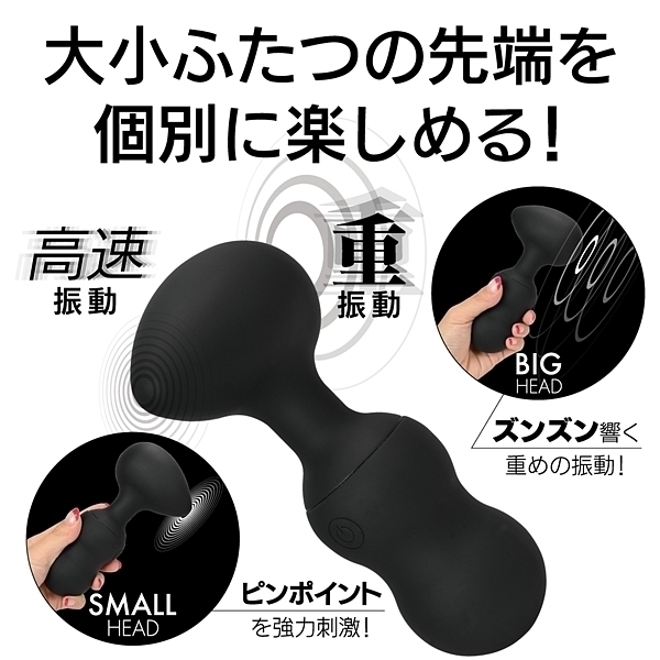 エッグ型ヘッドの左右に大小、サイズの違うモーターを配置!小ヘッドにはピンポイント用に微細振動モーターでポイント刺激を楽しめます。