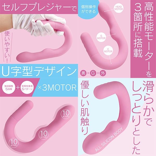 セルフケアに特化したU字型バイブレーターです♪ヘッド・Gポイント・外側への刺激、それぞれに専用モーターを搭載!3箇所を個別に操作できるので、好みに合わせた細かなカスタマイズが可能です♪振動は5段階の強弱調整と5種類のリズミカルなパターンを組み合わせた、計10種類を搭載!押し当てて楽しむ独自の形状が、今までにない使用感を提供します♪高性能モーターと高品質素材を組み合わせた、安心のジャパンクオリティ設計!オールシリコンボディは、しっとりとしたやさしい触り心地で、ストレスフリーな使い心地を実現しています♪約120分の充電で、最大約60分の連続使用が可能!(使用環境により変動します!)IPX6の防水仕様で、使用後も簡単に洗えて衛生的です♪
