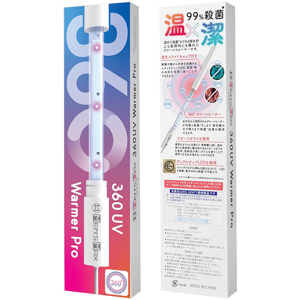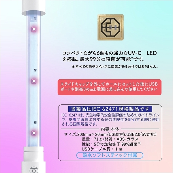 3分で急速加熱、UVランプで360°殺菌、20センチのロングサイズ、乾燥に便利な吸水ソフト、ティック付属、USBケーブル長さ1m。