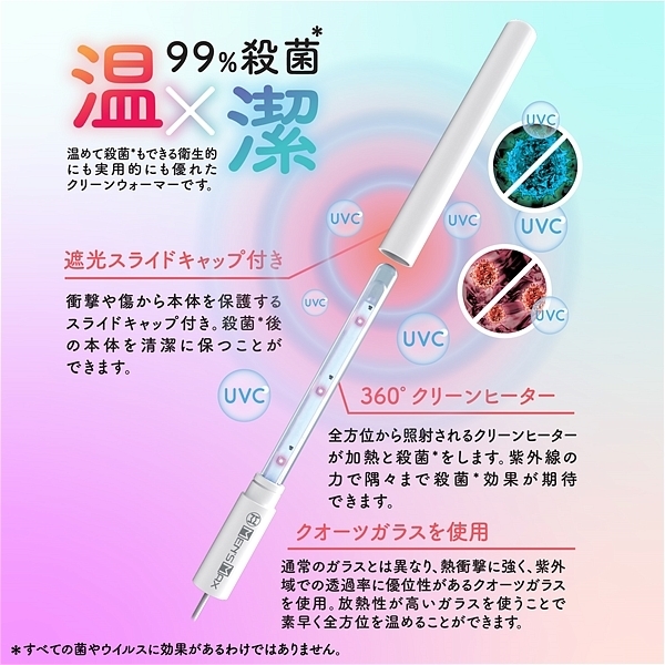 ■使い方手順@本体キャップを外すAウォーマーをホールにセットするBUSB電源をセットして加熱と、除菌を開始します<ロングサイズ>本体サイズは20cmで大型ホールの使用も安心です<液体に強い 生活防水仕様>材質はABS・ガラスなので安心の生活防水仕様。