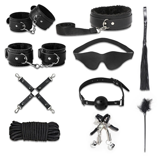 セット内容:手枷、足枷、リード付き首輪、手枷足枷十字連結、乳首枷、拘束ロープ、アイマスク、ボールギャグ、バラムチ、フェザー