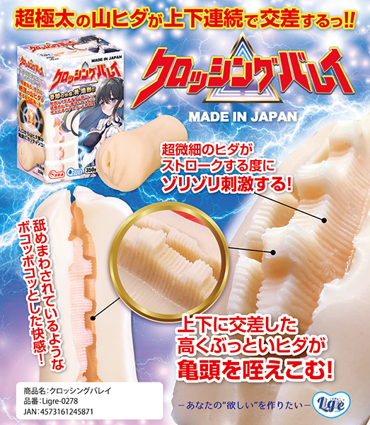 超極太の山ヒダが上下連続で交差する!山ヒダオナホ「クロッシングバレイ」が登場です!ヒダ山脈のように高くぶっといヒダが亀頭に直撃する!しかも超細かいヒダがそれぞれの山に搭載されており、ゾリゾリ感を味わいながらも隙間なく積み上げられた上下に交差する山ヒダで、亀頭が完全に咥え込まれる!ガッチャンコだ!350gの肉厚で内部の隙間がほどんどない程の重厚感!ボコッボコッっとなりながらも亀頭が舐めまわされるような快感!これはかつてない造形だ!快感だ!この奇跡の造形の前では我慢などできまい!山に任せて心行くまでピストン運動!そして即暴発!