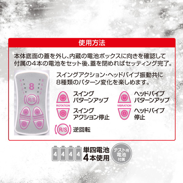 パッケージ:23.2×7.5×4.0cm 本体:21.7×3.4cm 重量:134g 電池:単四電池×4本使用