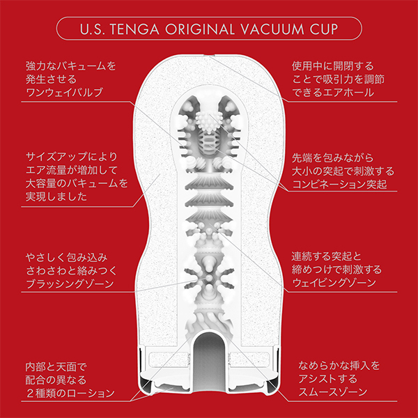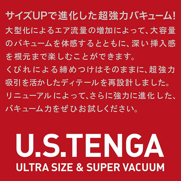 強いバキューム感を得られる「US TENGA」がリニューアル!ノーマルサイズのテンガより約1.6倍の体積に設計しました♪内部構造も専用設計で内部と天面ではそれぞれ異なる2種類のローションを充填。