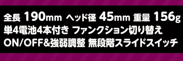 パッケージ:22.8×16.3×5.5cm 本体:全長19.0cm ヘッド径4.5cm 重量:156g 電池:単四電池×4本使用