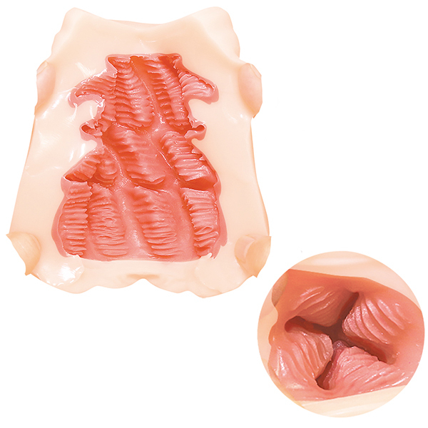 2層構造による粘膜を思わせる内部は高弾力、高伸縮でトルネード配置された触手ヒダにより、挿入すると奥へ引きずり込まれるような快感の渦が堪能できます♪3段階に分けてセットされた肉襞に細かく施されたミゾ。