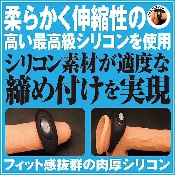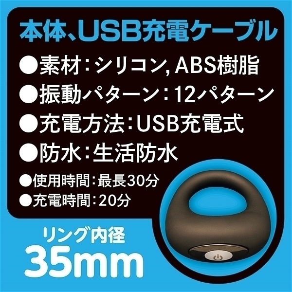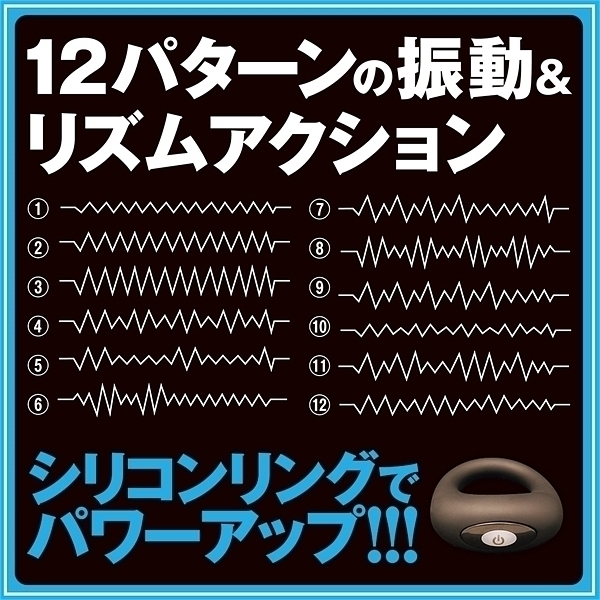 シリコンリングでパワーアップ!12パターンの振動&リズムアクション、フィット感抜群の肉厚シリコン、肌に優しく自然の感触、伸縮性抜群!高品質シリコンの滑らかな肌触り、柔らかく伸縮性の高い最高級シリコンを使用、シリコン素材が適度な締め付けを実現、ぴったりフィット●素材:シリコン、ABS樹脂●振動パターン:12パターン●充電方法:USB充電式●防水:生活防水●使用時間:最長30分●充電時間:20分