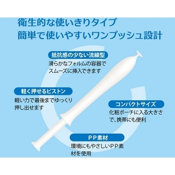 ●ビデに代わる膣専用ケアグッズ●一回一本使い切りの膣洗浄器●弱酸性&無香料の透明ジェル●自浄作用を高める乳酸を配合●洗浄ジェルをダイレクトに注入●直接触れずに使えるペン型容器●簡単かつ衛生的なワンタッチ式●使いやすいなめらかフォルム●婦人科医との共同開発で安心●携帯しやすい個包装×10本入り。