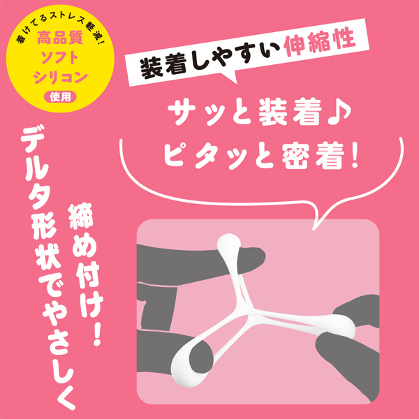 サッと簡単お手軽装着♪デルタ形状で根元を3点締めしてくれる「ぷにっとりんぐ」からデルタ ソフトverが登場しました!ソフトな締め付けで勃起の維持や早イキをしっかり抑制!萎え気味の竿をしっかりと補強してくれます。