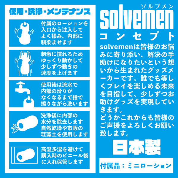 普段からゆったりとした余裕のある内部構造を待ち望んでいた方にとっての嬉しい仕様♪柔らかめの素材で無理なく長時間楽しめるように工夫されていて、ねじれヒダと内部の広さ、焦らしが織りなすソルブメンのコンセプト型ホールなら毎日楽しみながら新しい扉を開く事ができる事でしょう。
