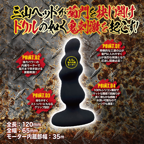 菊門広げ挿入せよ!敏感な部分を強力な振動と独特な三山ヘッドが鬼刺激し悶絶必至!!4.5Vの強力パワー&10ファンクションシステム搭載&100%シリコンの電動アナルイカセプラグ登場!!強力パワーの内蔵モーターで脳天まで突き抜ける振動刺激!