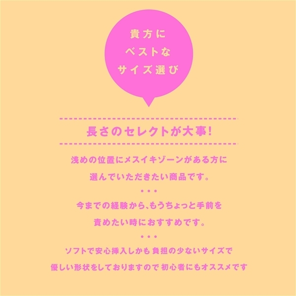ゆっくり快感焦らしイキ!PPPより、メスイキゾーンの位置が浅めな方にフィットしやすいエネマのソフトverが登場!ソフトで安心挿入&フィット感が更にUP!貴方にベストなサイズ選び、長さのセレクトが大事!浅めの位置にメスイキゾーンがある方に選んでいただきたい商品です。