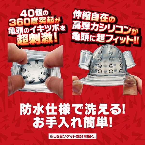 20種類の振動パターンがカリ首を的確に刺激し、ハンズフリーで楽しめる仕様!高弾力シリコンで亀頭をしっかりホールドし、内蔵された40個の突起が絶妙なイキツボを刺激します♪パワフルなツインローターで裏表からカリ首を責め立て、絶頂へと導きます!USB充電式で、ワンボタン操作が簡単便利。
